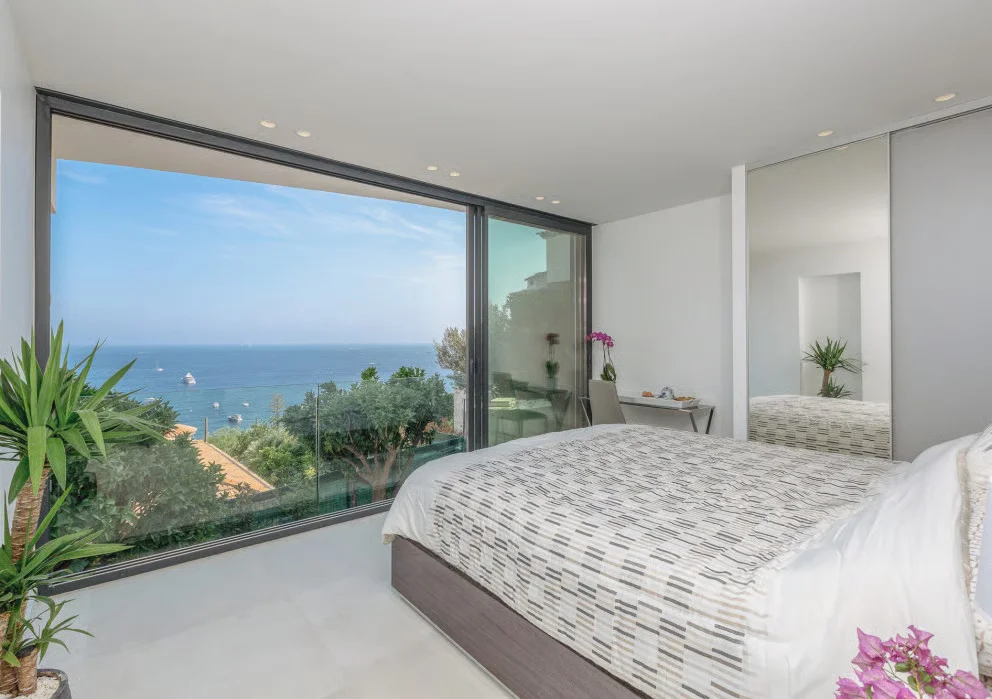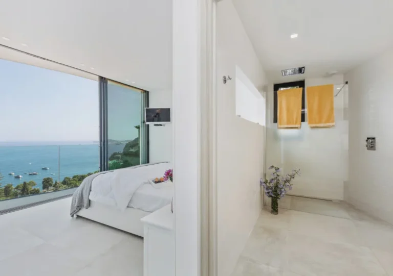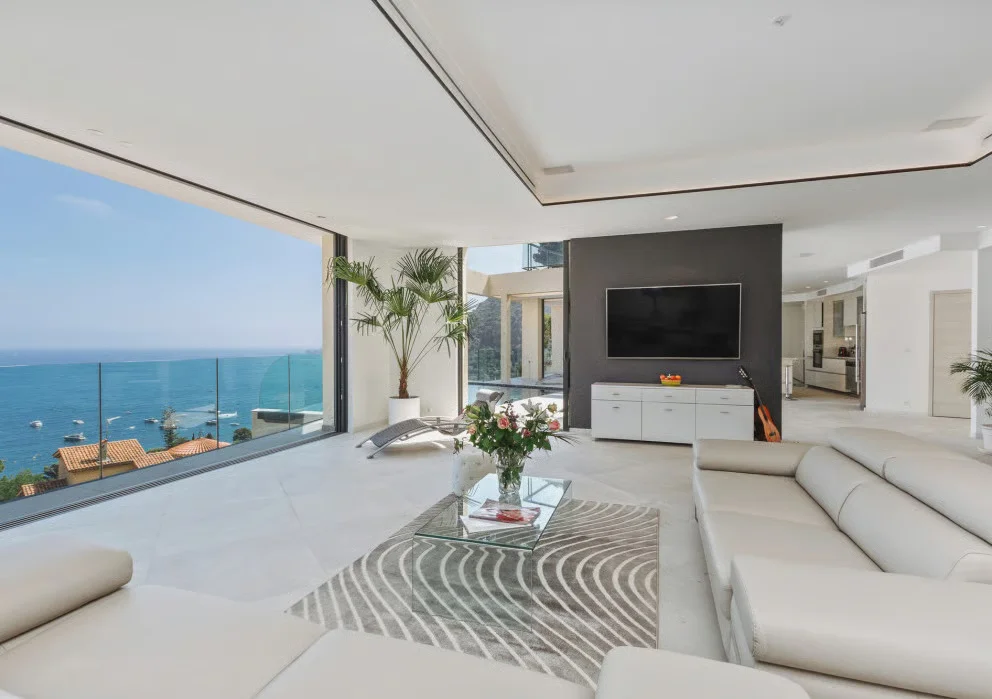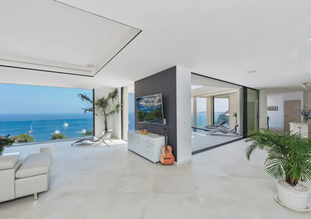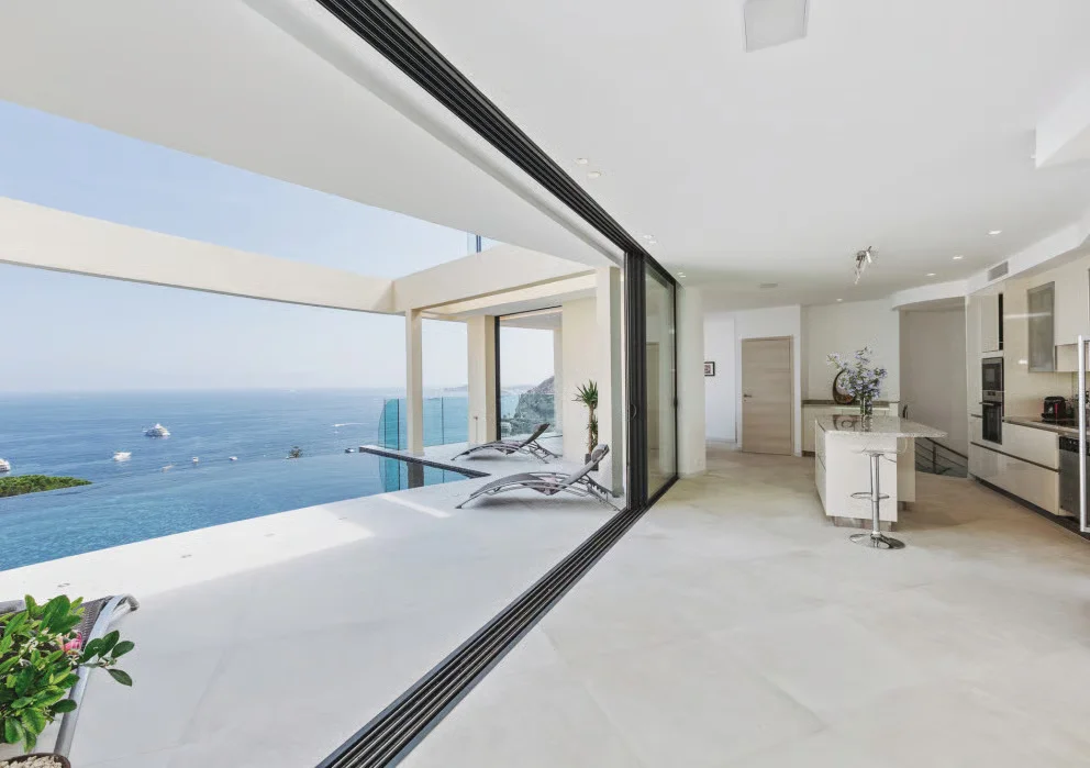This luxury villa offers an open living plan featuring a spacious living room, fully fitted kitchen and dining area. There are floor to ceiling windows looking out to the sea and surrounding hills. Moreover, there are large pocket sliding glass doors surrounding the terrace and pool area. The home was designed and furnished in a casual modern style in order to better showcase the breathtaking views.