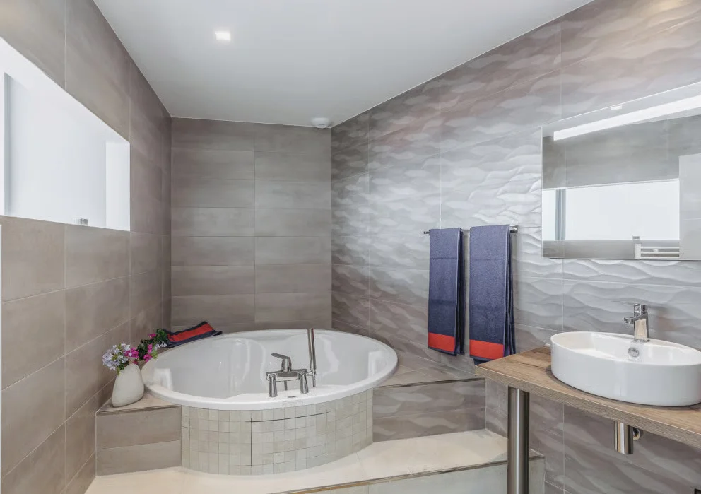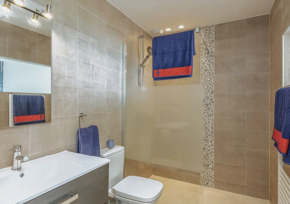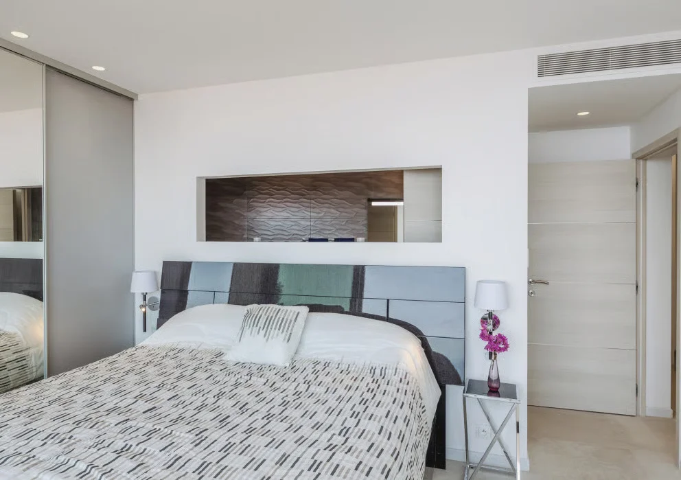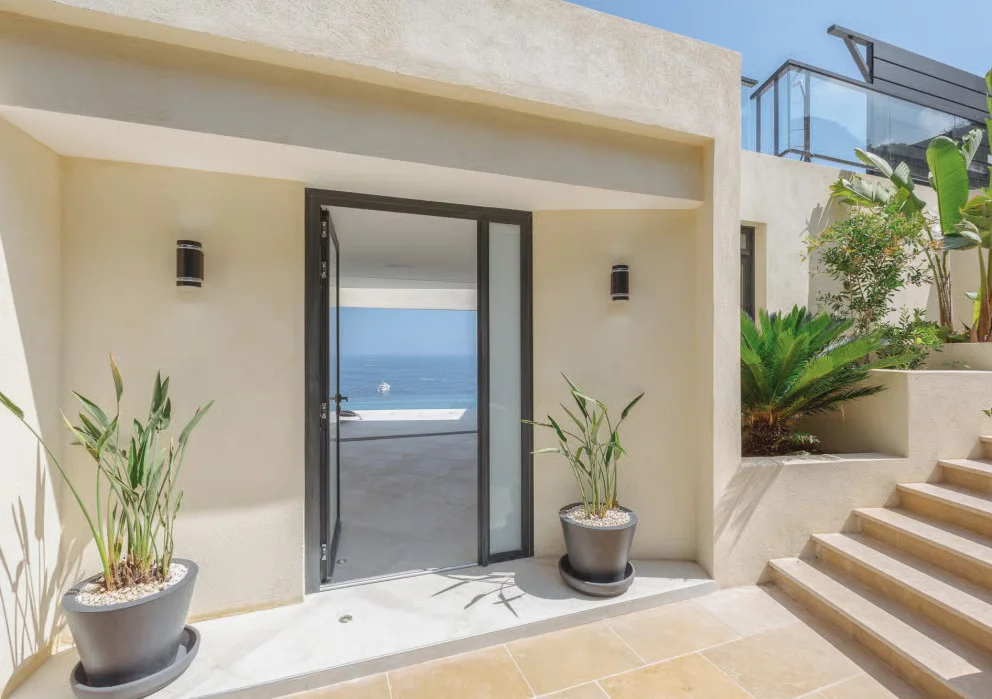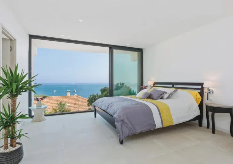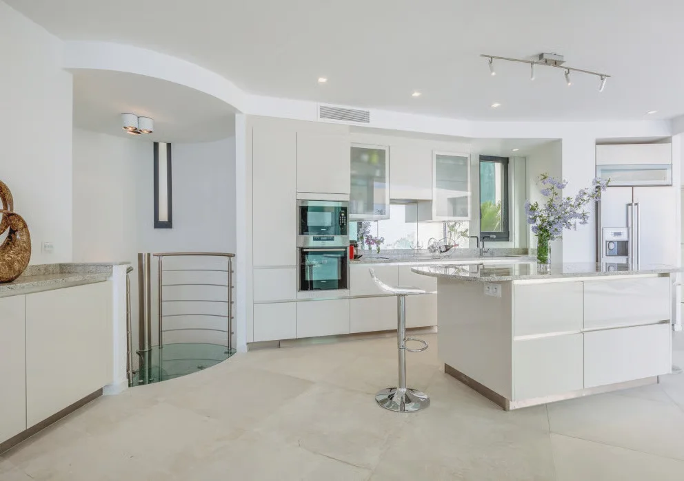 This luxury villa offers an open living plan featuring a spacious living room, fully fitted kitchen and dining area. There are floor to ceiling windows looking out to the sea and surrounding hills. Moreover, there are large pocket sliding glass doors surrounding the terrace and pool area. The home was designed and furnished in a casual modern style in order to better showcase the breathtaking views.