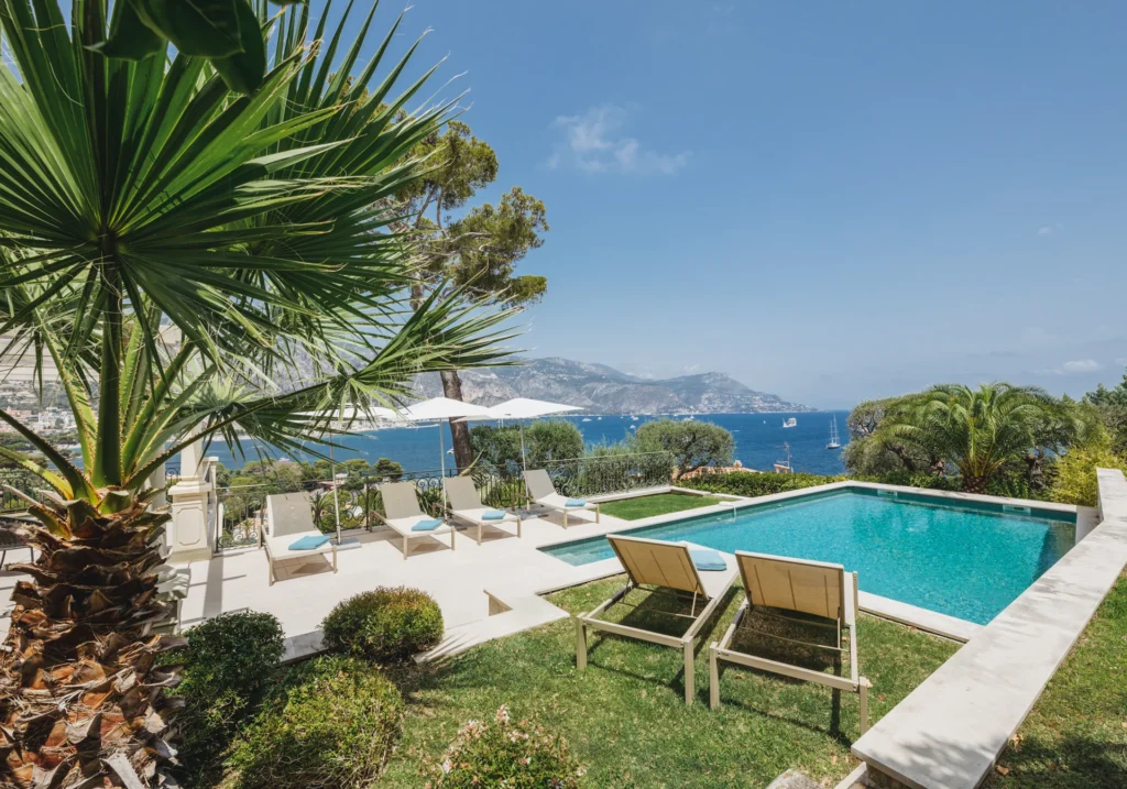 The exteriors feature meticulously landscaped gardens with a lush lawn and expansive terraces offering breathtaking views. Guests can also enjoy a heated pool surrounded by comfortable sunbeds, an al fresco dining area complete with a BBQ, spectacular views of the surrounding hills and Mediterranean Sea, and easy access to the nearby beaches and the town center of Saint-Jean-Cap-Ferrat, making this home an ideal getaway on the French Riviera.