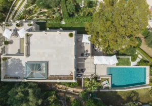 The home is set across three floors, connected by an elevator, and offers a grand entrance, expansive living areas, a dining area, and a fully equipped kitchen with a central island and a pantry, along with a total of six guest bedrooms. Each bedroom is furnished with luxurious bedding and en-suite bathrooms. The exceptional master suite features its own TV lounge, a lavish en-suite bathroom with a stand-alone bathtub, and a private terrace overlooking the Mediterranean. The villa also offers a home gym and an independent apartment, equipped to comfortably accommodate two staff members.