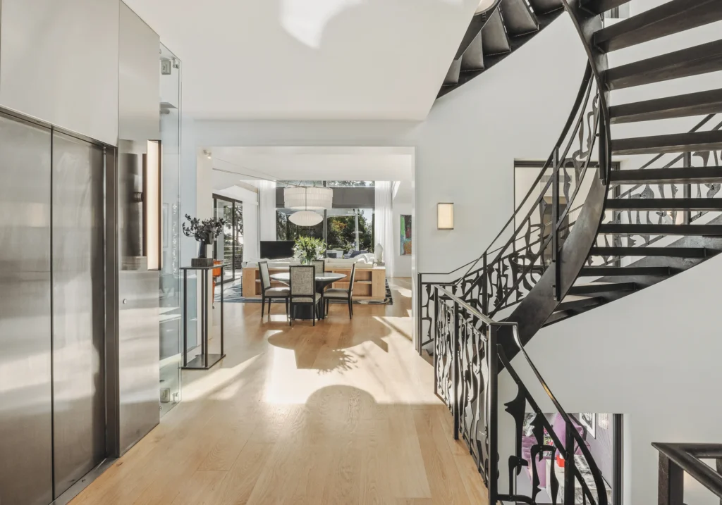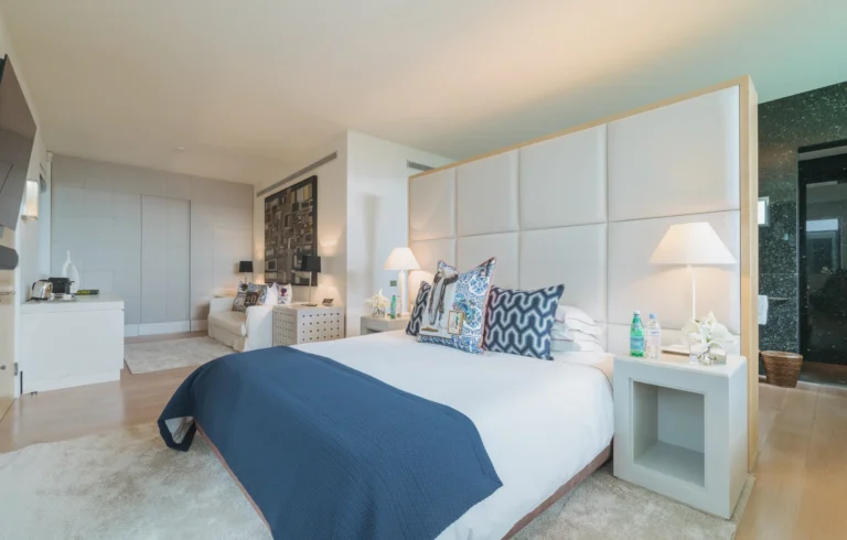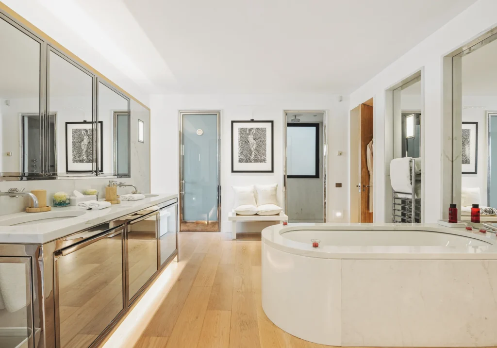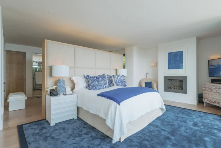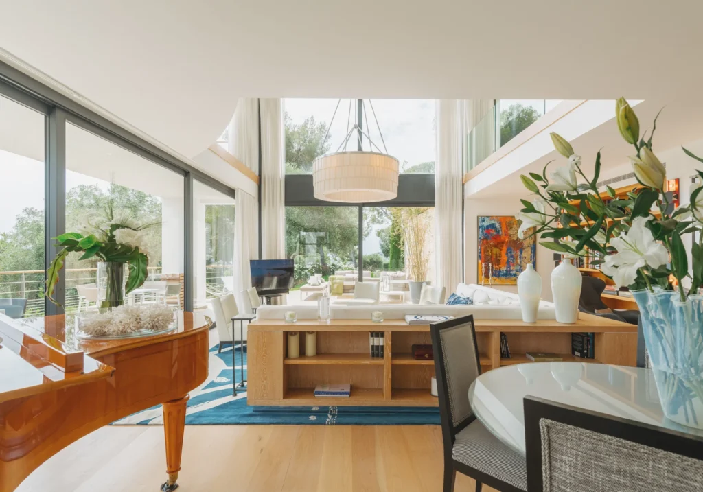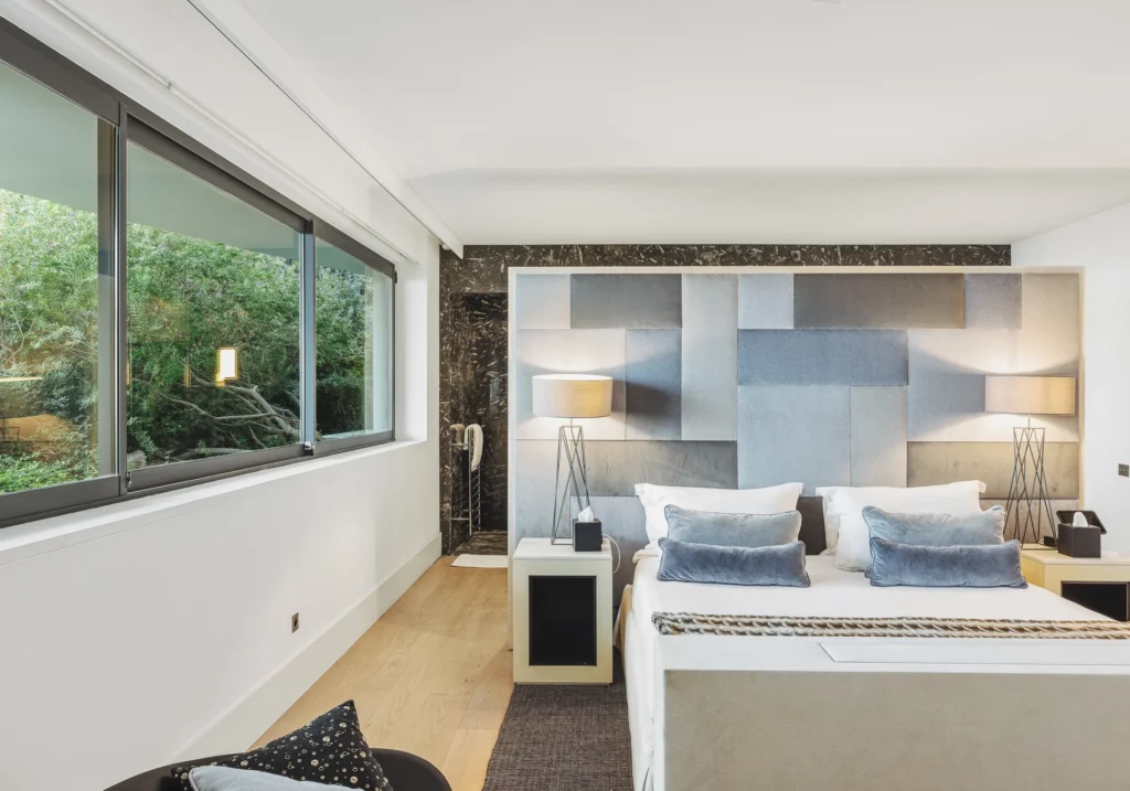 The interior spaces are bright with natural light, spacious and decorated to the highest possible standard. The cool white walls, modern sofas, stunning reception, beds, and dining room are nothing short of impressive. In addition, the glass elevator is a showstopper in itself and offers guests a way to enjoy the view as they travel from one floor to the next.
