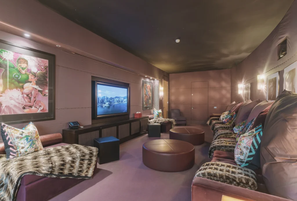 Featuring an open living plan, the villa comprises a spacious living room, a dining area, and a fully fitted kitchen, all located on the 2nd floor. A sitting area with a study is situated on the 3rd floor, while the home cinema is located on the 1st floor. Expansive glass windows and sliding glass doors throughout the villa enhance the stunning sea views. There are numerous outdoor dining and lounge areas for relaxation and entertainment, including the rooftop terrace with an infinity pool and pergola, beside the second pool and hot tub in the garden. Additionally, there is an outdoor gym.