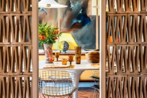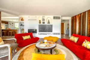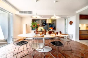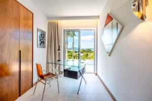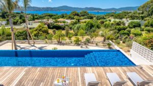 Villa Palm 70’s, nestled in Grimaud, beautifully combines a modern, minimalist interior with a distinctly Provençal exterior. Surrounded by a lush garden, it offers a spectacular view of the sea.