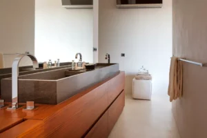 This villa has 4 bedrooms including a master bedroom that opens onto the main floor terrace. A full private bathroom includes a soothing Italian-style shower along the entire width of the wall. The other 3 bedrooms each have their own shower rooms and private balconies with a view of the infinity pool.