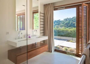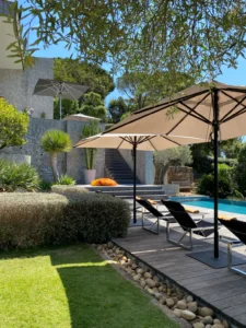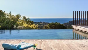 At High Ticket Brokers, we present Villa In the heights of the Croix-Valmer hills, surrounded by huge cacti, the silhouette of this villa pulls inspiration from Mexican architecture. The swimming pool blends into the infinite landscape of pine trees and sea.