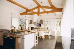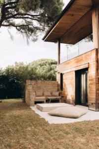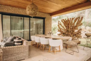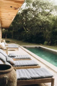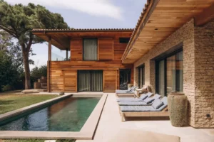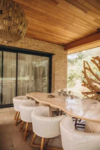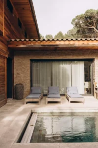 The pine structure of this villa blends perfectly into the landscape. Its stone terrace and swimming pool resembling a natural pond, echo the wild coves of the Saint Tropez peninsula. Inside, the attic ceiling and the beautiful exposed beams are reminiscent of Provencal family houses. Sit around the large wooden table, or gather by the fireside, on the magnificent beige linen sofa. In the study, you can pretend to be an explorer, looking through the old telescope or sitting in the old leather armchair and reading about seafarers’ adventures. On the other side of the bay windows, you feel as if on a boat: the terrace seems to float over the top of the pines that extend as far as the eye can see.