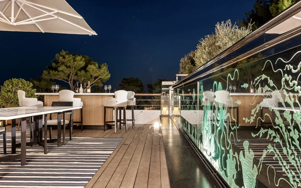 The villa’s external spaces are as breathtaking as its interiors. Featuring a diverse array of amenities including pagodas, terraces, a heated swimming pool, and a hot tub, alongside a rooftop infinity pool and meticulously groomed lawns, each corner of Villa Olympia is a testament to elegance and refinement. These exquisite outdoor areas are designed to maximize the stunning vistas of the Mediterranean, ensuring a picturesque backdrop to every moment spent here.