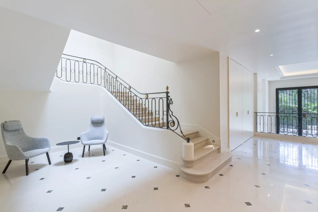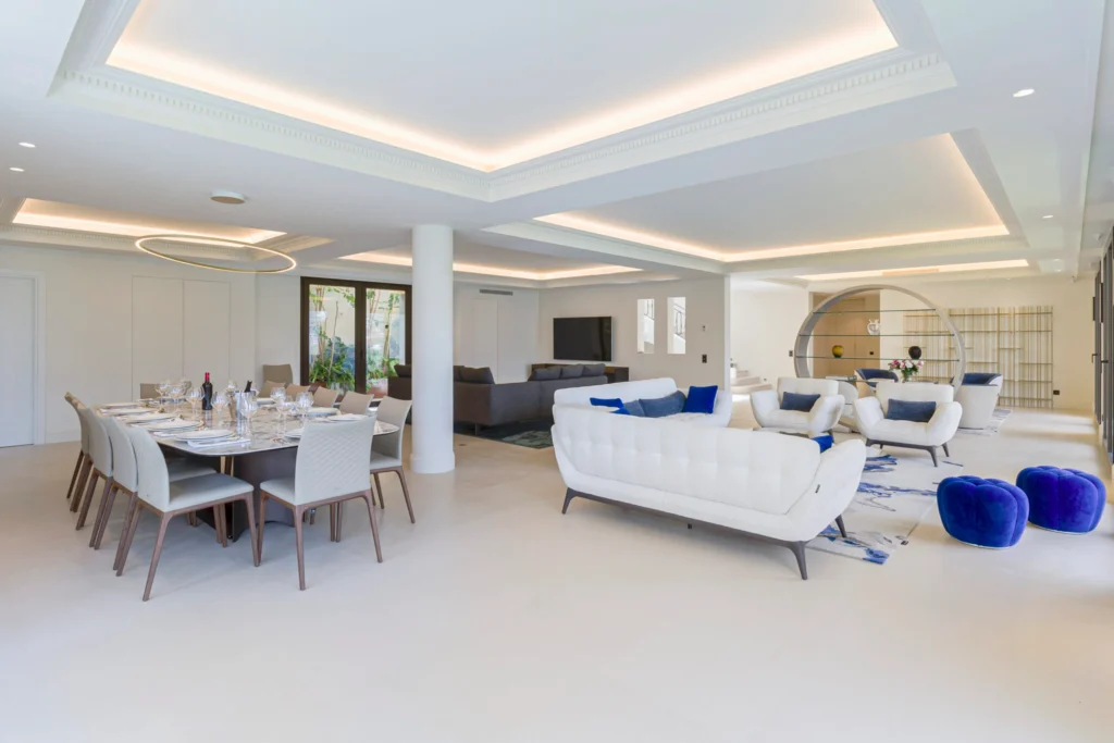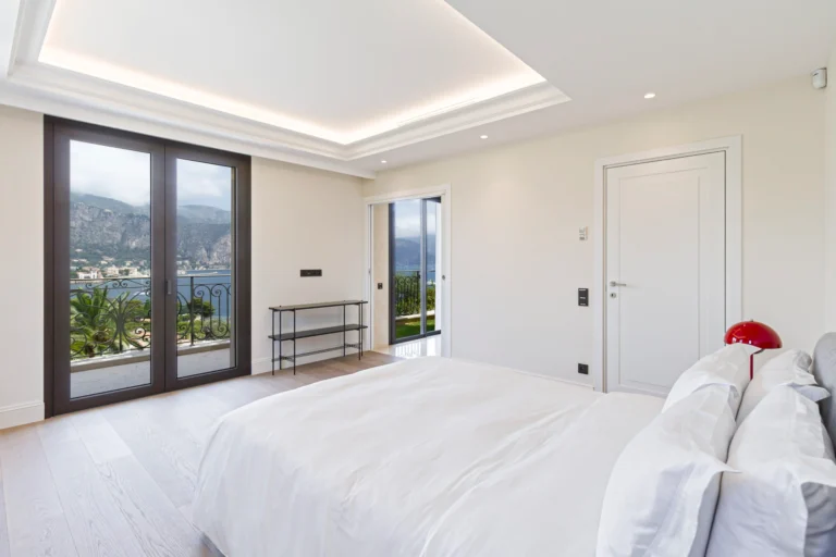 The villa provides 600m² of stylish living space across three levels, with guest and staff lifts ensuring easy access, including to a rooftop terrace with breathtaking Riviera and Mediterranean views. It features six luxurious bedrooms, with the master suite boasting a private lounge, home cinema, and terrace. The spacious 150m² main living area is complemented by a dining room, cinema space, and state-of-the-art home automation. Active guests can enjoy a fully-equipped gym.